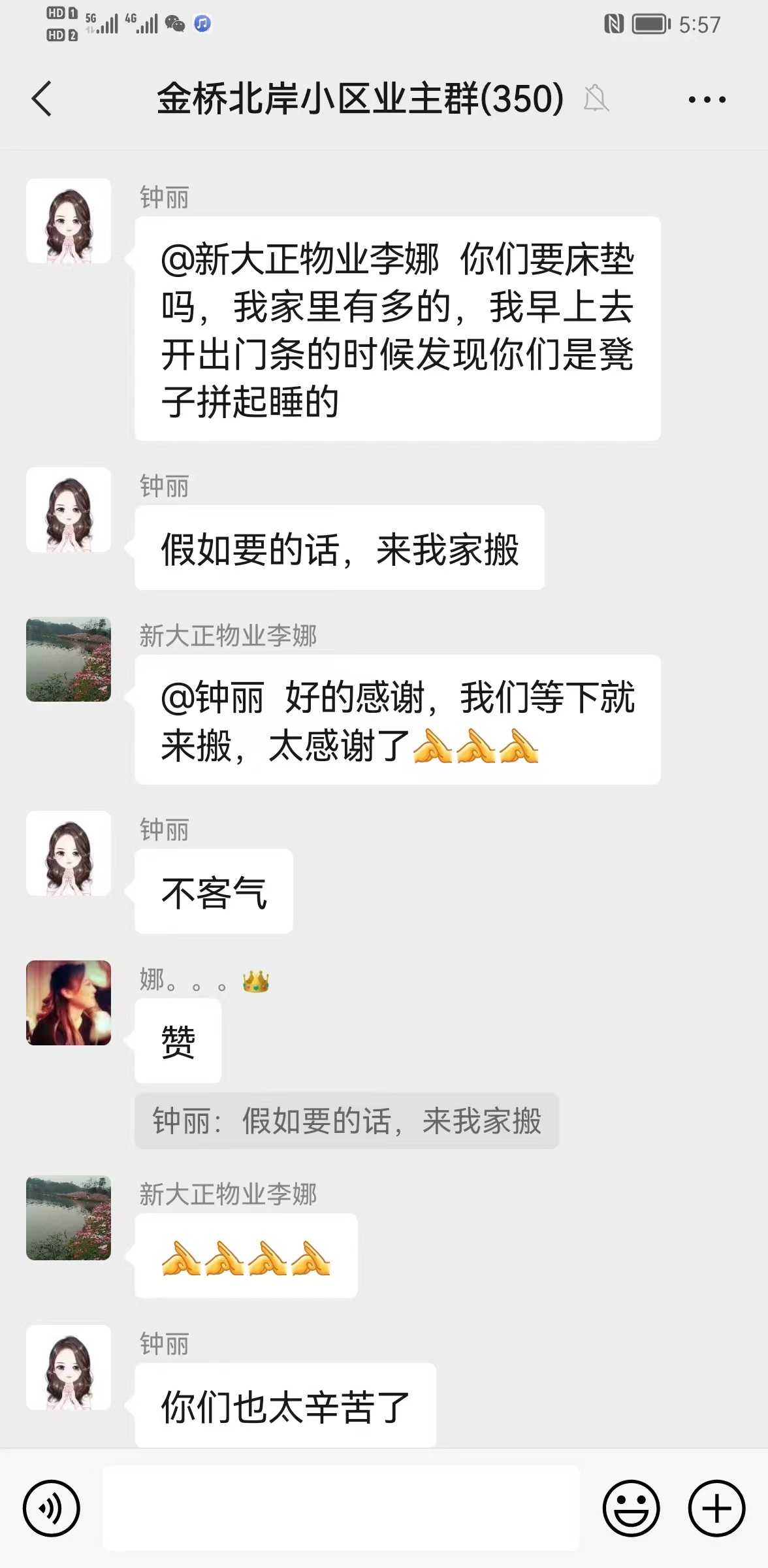物业人员不多,面对368户业主的不同需求,有时忙不过来。一开始,有的业主不理解,但大多数业主是理解的,经常在群里喊话“大家别再抱怨了,他们是人不是神,不能面面具到,希望大家相互理解,相互包容,换位思考”。