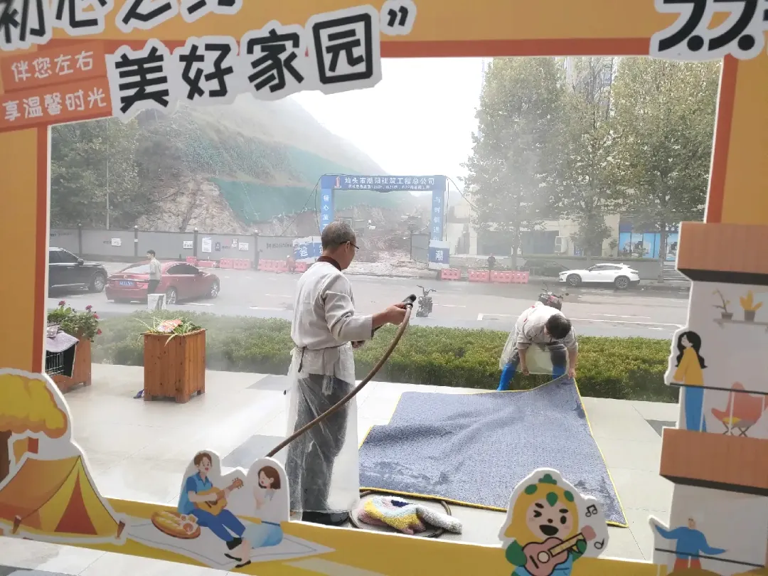 保洁员用地毯清洗剂、刷子、高压水枪等清洁工具,对每一块地垫进行细致清理和冲洗,并选择通风、采光好的地方集中晾晒,晒干后再送到业主家里。一块块地毯在物业人手里变得焕然一新,既清洁了垫子,又温暖了业主心。